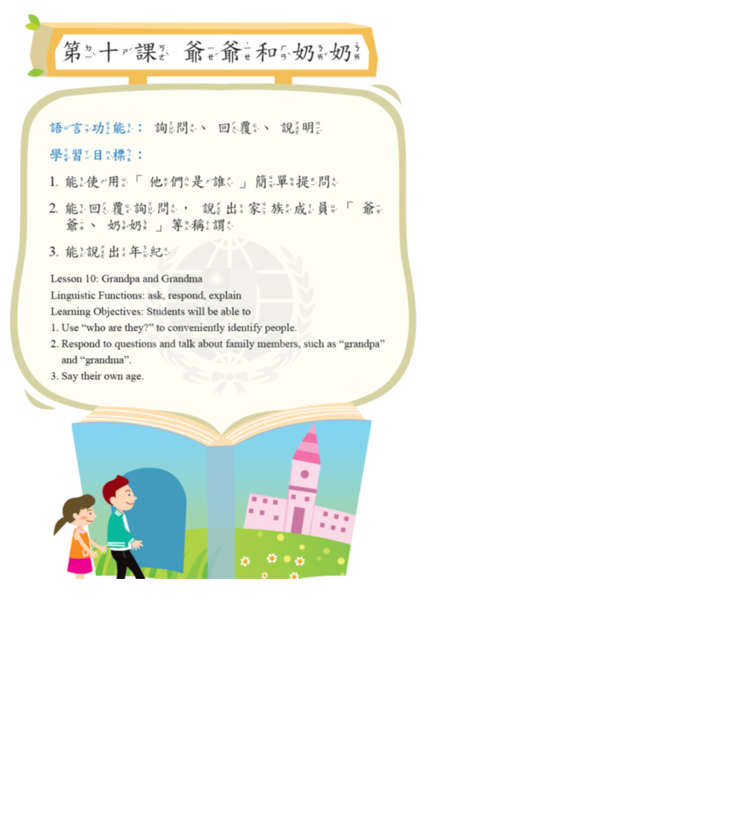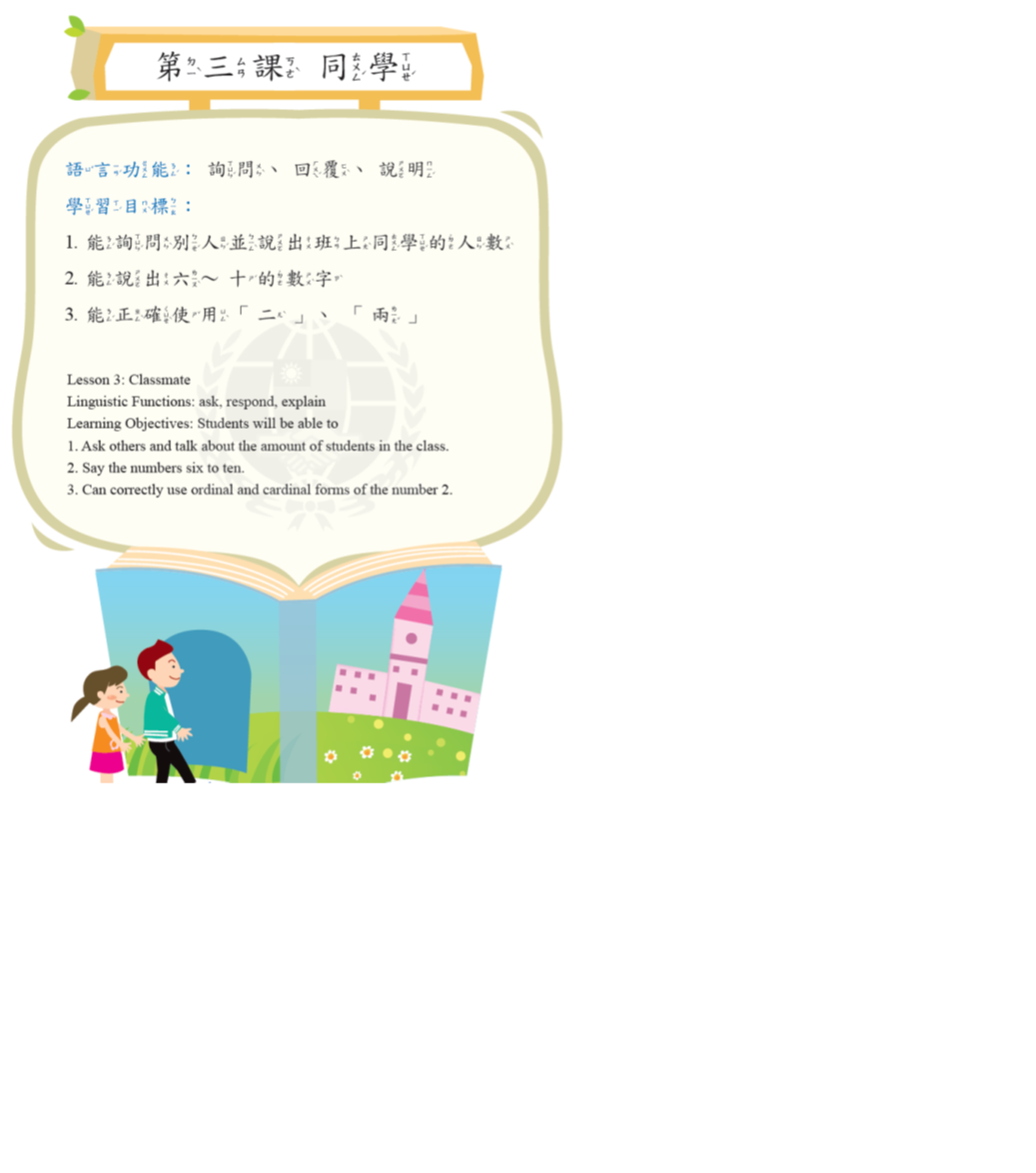 語言功能:詢問、回覆、敘述、數詞(1~5)